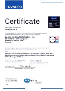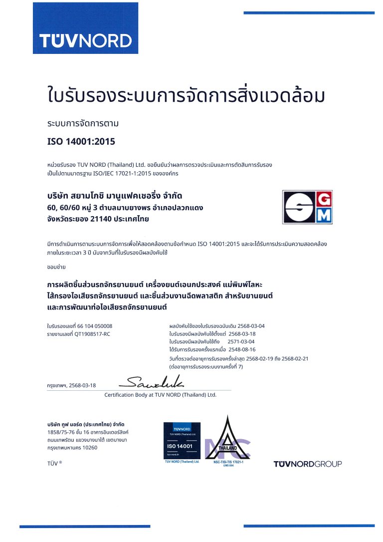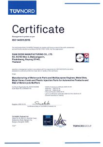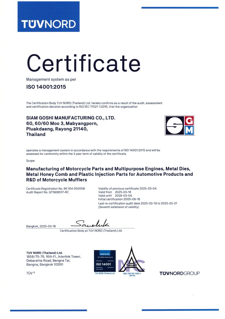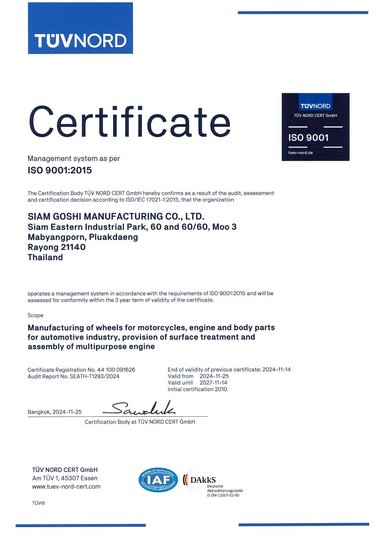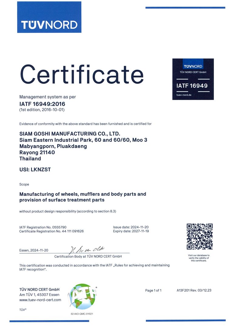 Quality : ISO 9001 : 2015, IATF 16949 Environment : ISO 14001 : 2015 Safety : ISO 45001 : 2018 |